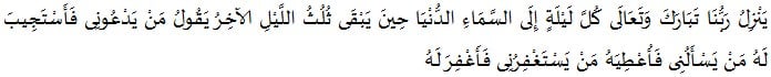 ” Rabb kita, tabaraka wata’ala turun kelangit dunia ketika tersisa sepertiga malam terakhir. Lantas Allah SWT berfirman, “Siapa saja yang berdo’a kepada-Ku, maka akan Aku kabulkan. Siapa yang meminta kepada-Ku, maka Aku beri. Siapa yang meminta ampunan kepada-Ku, maka Aku ampuni.” (HR. Bukhari, no. 1145 dan Muslim, no. 758).