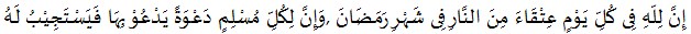 Artinya: ” Sesungguhnya Allah Membebaskan beberapa orang dari api nekara pada setiap hari di bulan Ramadhan, dan setiap muslim apabila dia memanjatkan do’a, akan dikabulkan.” (HR. Al-Bazaar Al-Haitsami dalam Majma’ Az-Zawaid, 10: 14 mengatakan bahwa perowinya tsiqoh -terpercaya.- Lihat jami Al-Ahadist, 9:224)