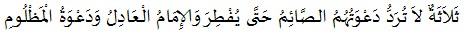 Artinya: ” Tiga orang yang do’a tidak tertolak: orang yang berpuasa sampai ia berbuka, pemimpin yang adil, dan do’a orang yang terdzalimi.” (HR. At-Tirmidzi no.2526, 3598 dan Ibnu Majah no. 1752. Al-Hafizh Abu Thahir mengatakan bahwa hadist ini hasan)