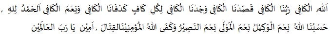 Artinya: ” Allah dzat yang Maha Mencukupkan, Rabb kami yang Maha Mencukupkan, kami bermaksud kepada Dzat Yang Maha Mencukupkan, kami temukan Dzat Yang Maha Mencukupkan kepada setiap sesuatu yang mencukupkan telah mencukupkan kepada kami Dzat Yang Maha Mencukupkan dan DIA lah sebaik-baik Dzat Yang Maha Mencukupkan, segala puji bagi Allah”