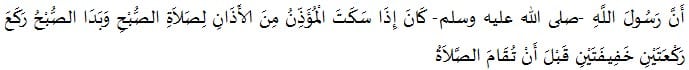 Artinya: “Rasulullah shallallahu ‘alaihi wa sallam dahulu diam antara adzannya muadzin hingga shalat Shubuh. Sebelum shalat Shubuh dimulai, beliau dahului dengan dua raka’at ringan.” (HR. Bukhari no. 618 dan Muslim no. 723).