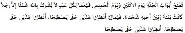 Artinya: ” Pintu-pintu surga dibuka pada hari senin dan kamis. Maka semua hamba yang tidak menyekutukan Allah dengan sesuatu apapun akan diampuni dosanya, kecuali seseorang yang diantara dia dan saudaranya terjadi permusuhan. Lalu dikatakan, ‘Tundalah pengampunan terhadap kedua orang ini sampai keduanya berdamai, tundalah pengampunan terhadap kedua orang ini sampai keduanya berdamai, tundalah pengampunan terhadap kedua orang ini sampai keduanya berdamai” (HR. Muslim).